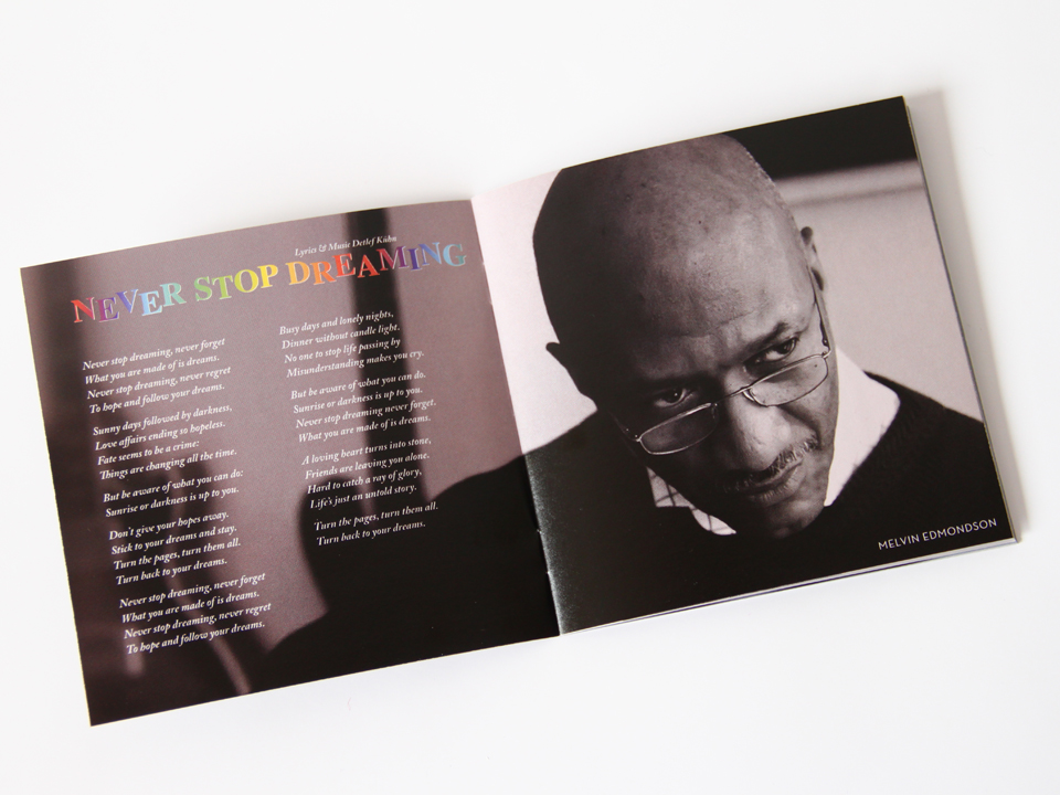 Berlin Ballroom’s debut album “Never Stop Dreaming” presents timeless, emotionally charged songs written by Detlef Kühn and Maria Sieren: “Songs of love and hope for mournful hearts”. Producer and arranger Volker Schlott contributed the Berlin Blues, an alluring and artistic sax instrumental. Berlin Ballroom provides sophisticated pop: romantic and hopeful, sometimes thoughtful and melancholy, but always dreaming of better times to come. It interweaves elements of jazz, pop chanson, soul, gospel and Scottish folksong, with a special tribute to Nat King Cole and Cole Porter.